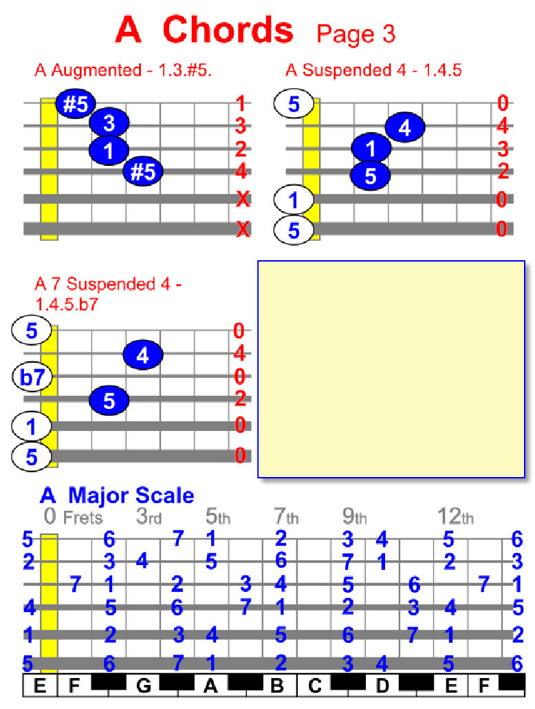 By viewing the Major Scale Diagram shown below you can find chords and scales in different positions, plus you can find chords and scales on piano/keyboard too.
