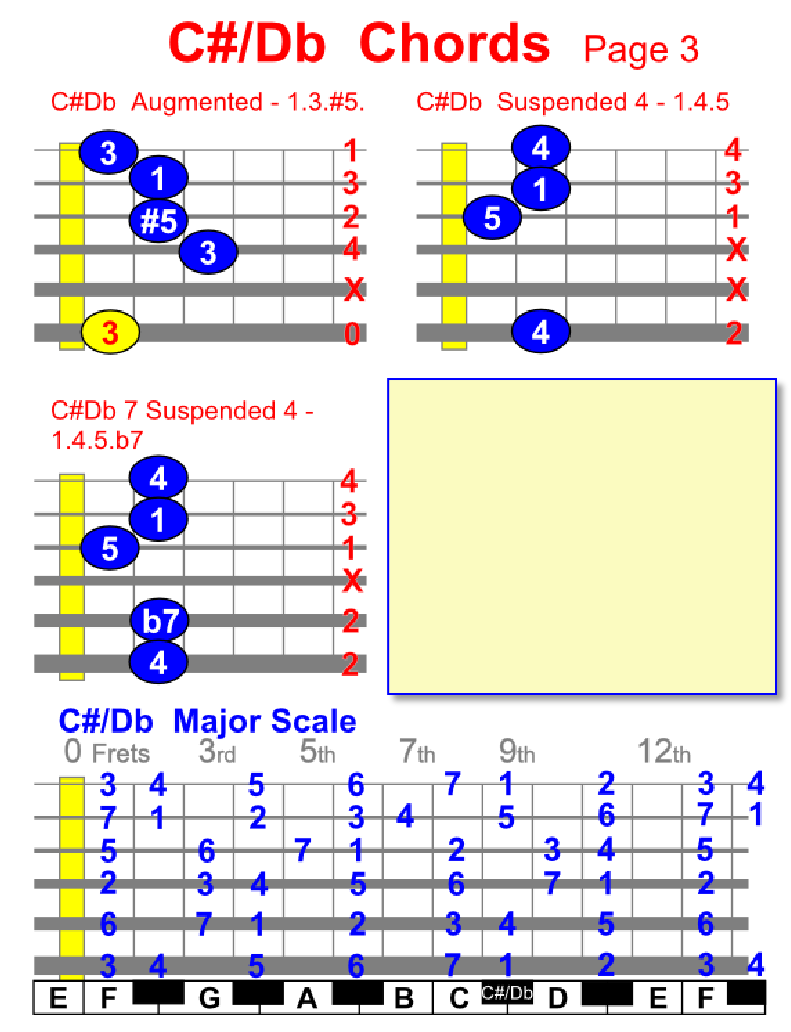 By viewing the Major Scale Diagram shown below you can find chords and scales in different positions, plus you can find chords and scales on piano/keyboard too.