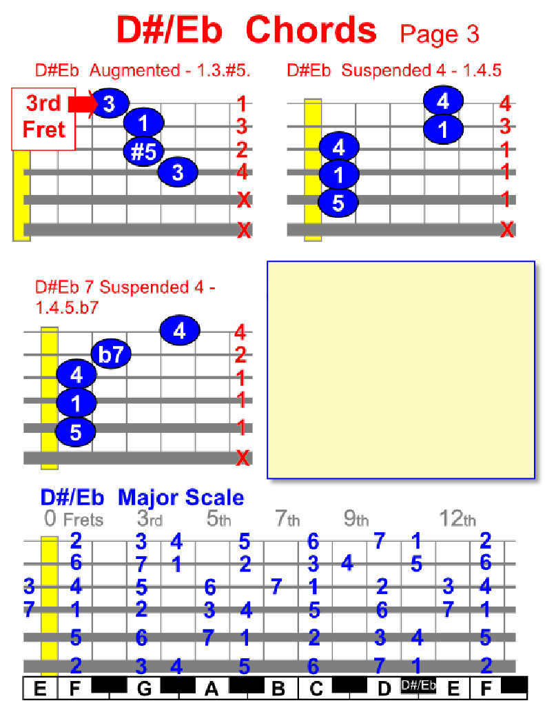 By viewing the Major Scale Diagram shown below you can find chords and scales in different positions, plus you can find chords and scales on piano/keyboard too.